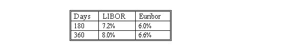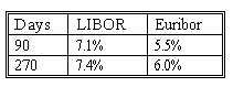 Consider a one-year currency swap with semi-annual payments. The two currencies are the US$ and the Euro. The current exchange rate is $0.75. The term structure of interest rates for LIBOR and Euribor are: