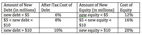Assuming the company's target capital structure is 50% debt and 50% equity, the corresponding marginal cost of capital schedule looks like this: