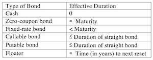 In either case the call/put option reduces the effective duration of the bond. The effective duration of a bond with embedded option(s) can never exceed that of the straight bond.