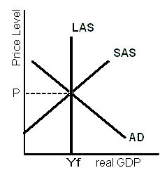 - This equilibrium between SAS and AD coincides with the maximum capacity of the economy, as indicated by the LAS curve. The level of output produced is labeled as Yf, indicating full employment of resources.