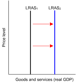 Long-run supply refers to the economy's long-run production possibilities (maximum rate of sustainable output). Increase in long-run aggregate supply (LRAS) is caused by: