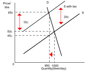 A 20c tax per liter on suppliers shifts the supply curve up by 20c, establishing a new equilibrium price (65c) and quantity (950 liters). Consumers pay 15c more - meaning they have paid 15c of the 20c tax. Suppliers receive 65c from consumers, pay 20c to the government and are left with 45c - 5c less than before. Suppliers have thus paid 5c towards the tax.