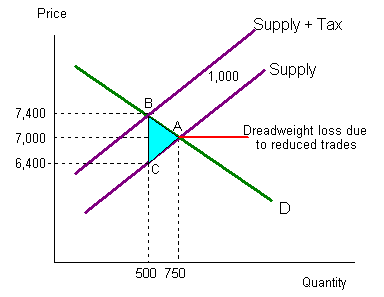 - As the example shows, the imposition of the $1,000 tax on used cars causes the number of units exchanged to fall from 750 to 500. As trade results in mutual gains for both buyers and sellers, the loss of mutual benefits that would have been derived had the tax not eliminated 250 units of exchange also imposes a cost on buyers and sellers. The loss is referred to as the deadweight loss of taxation. In the graph, the triangle ABC measures the size of the deadweight loss. It generates neither revenue for the government nor gains for any other party.