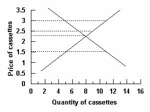 Given the supply and demand curves in the graph, the equilibrium price is $2.25. A price floor will be binding only if it is above the equilibrium price. So a price floor of $1.50 would not distort the market. The higher the floor above equilibrium price, the greater the market distortion (surplus). A price floor at $3.00 would create a larger surplus than a price floor at $2.50.