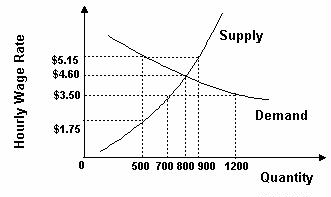 At $5.15 per hour, the quantity demanded is 500 and the quantity supplied is 900, resulting in a surplus of 400.