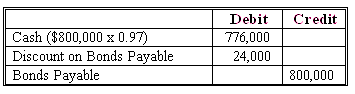 If $800,000 of bonds were issued on January 1, 2015 at 97, the issuance would be recorded as follows: