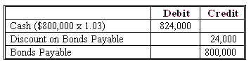 If $800,000 of bonds were issued on January 1, 2015 at 103, the issuance would be recorded as follows: