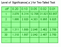 Suppose the sample size (n) is 30 and the level of significance (α) is 5%. df = n - 1 = 29. tα/2 = t0.025 = 2.045 (Find the 29 df row, and then move to the 0.05 column.)